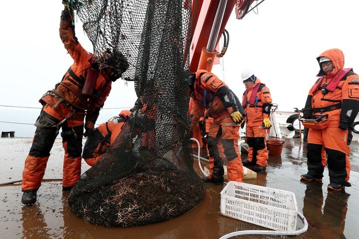 记者看到,每个站位获取的生物样品种类和数量各不相同。其中,海星、雪蟹、海鳃、海葵,以及管栖多毛类,是作业海域的优势动物。