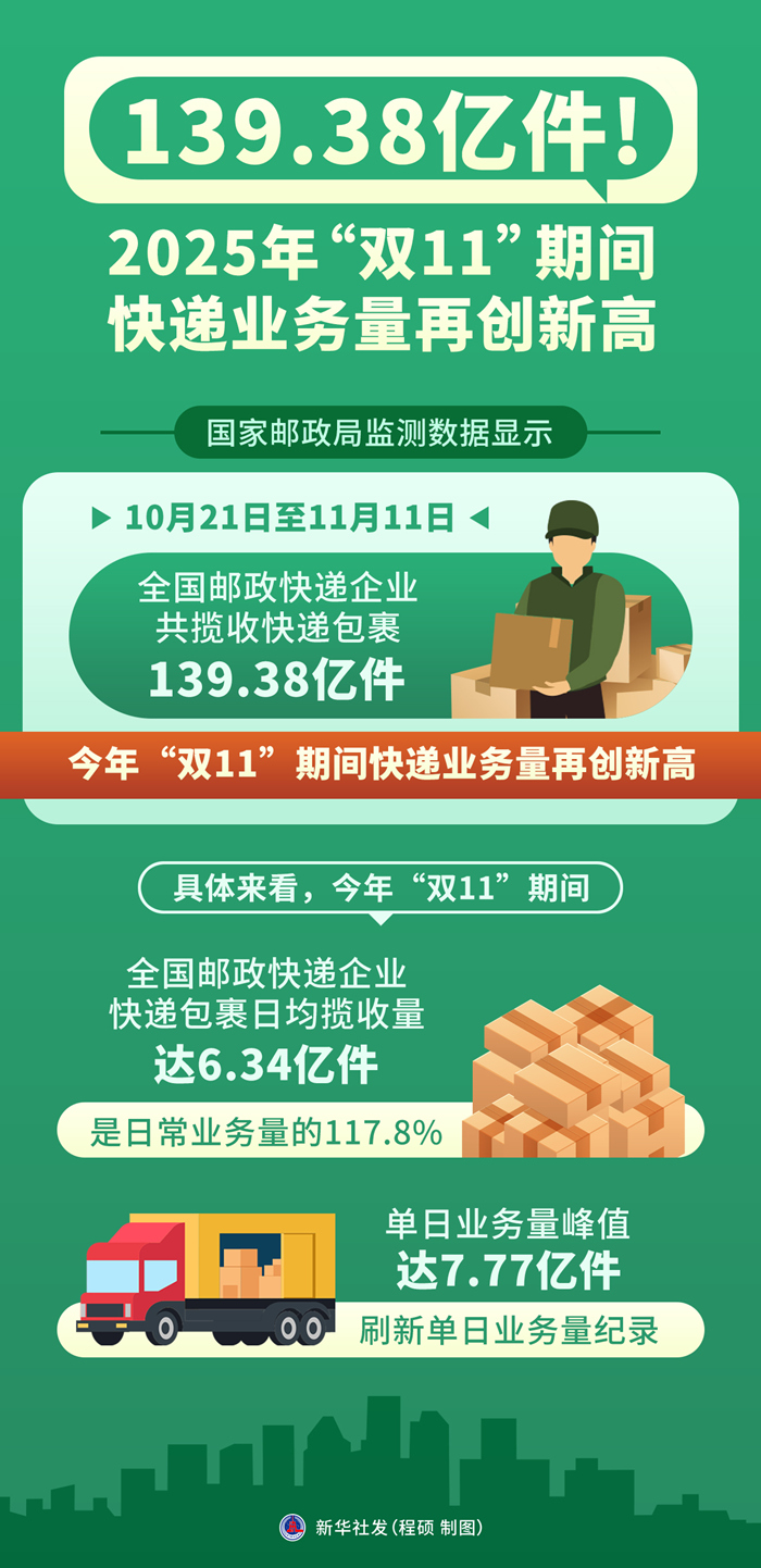 新华社北京11月12日电(记者叶昊鸣)记者11月12日从国家邮政局获悉,国家邮政局监测数据显示,10月21日至11月11日,全国邮政快递企业共揽收快递包裹139.38亿件,今年“双11”期间快递业务量再创新高。