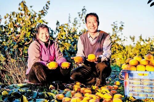 10月26日,张宝树和妻子手捧刚采收的柿子,满脸丰收的喜悦。