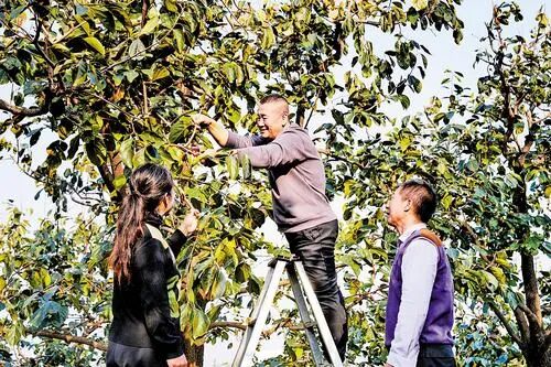 10月28日,易县盘柿源农业服务专业合作社联合社技术人员(中)为寨子村果农进行技术指导。