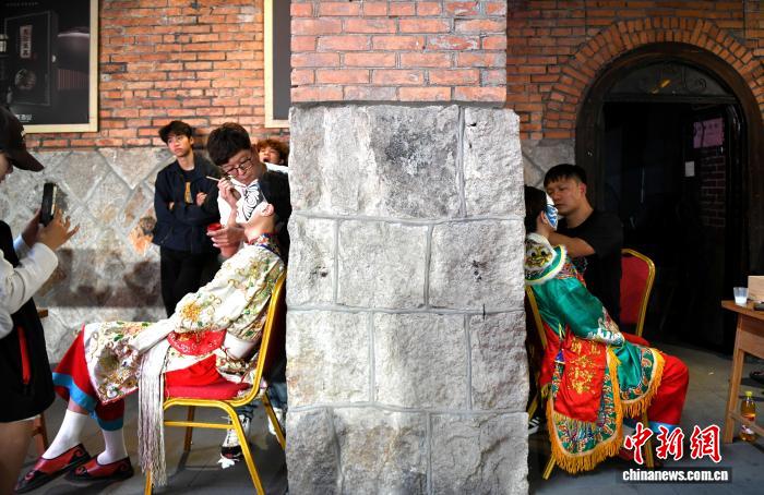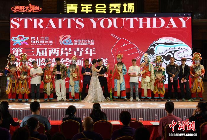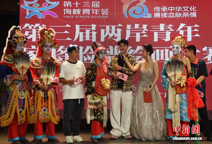 11月16日,“将来在福州——第三届两岸青年家将脸谱绘画大赛”在福州台江区举办,吸引两岸约百名青年齐聚。此前通过线上海选脱颖而出的两岸8名青年面师,现场抽签确定“甘柳范谢”四大将军及“春夏秋冬”四季福神等绘制对象,在60分钟内重现家将风采。图为参赛选手在台上谈创作心得。中新社记者 吕明 摄