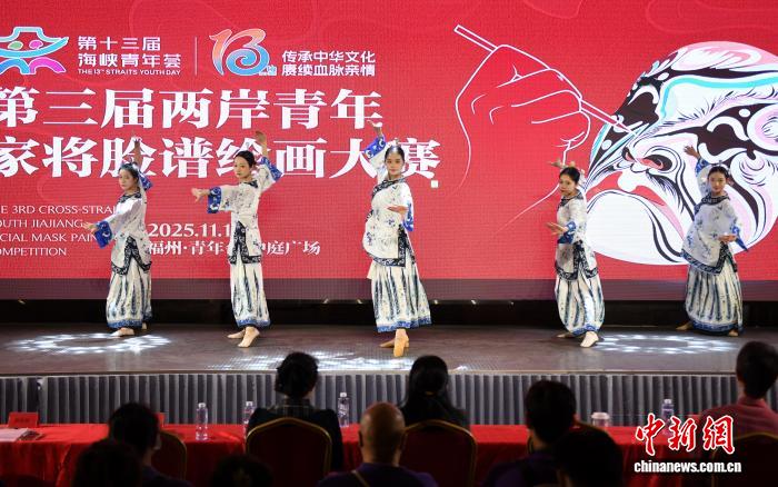 11月16日,“将来在福州——第三届两岸青年家将脸谱绘画大赛”在福州台江区举办,吸引两岸约百名青年齐聚。此前通过线上海选脱颖而出的两岸8名青年面师,现场抽签确定“甘柳范谢”四大将军及“春夏秋冬”四季福神等绘制对象,在60分钟内重现家将风采。图为三条簪舞蹈表演。中新社记者 吕明 摄