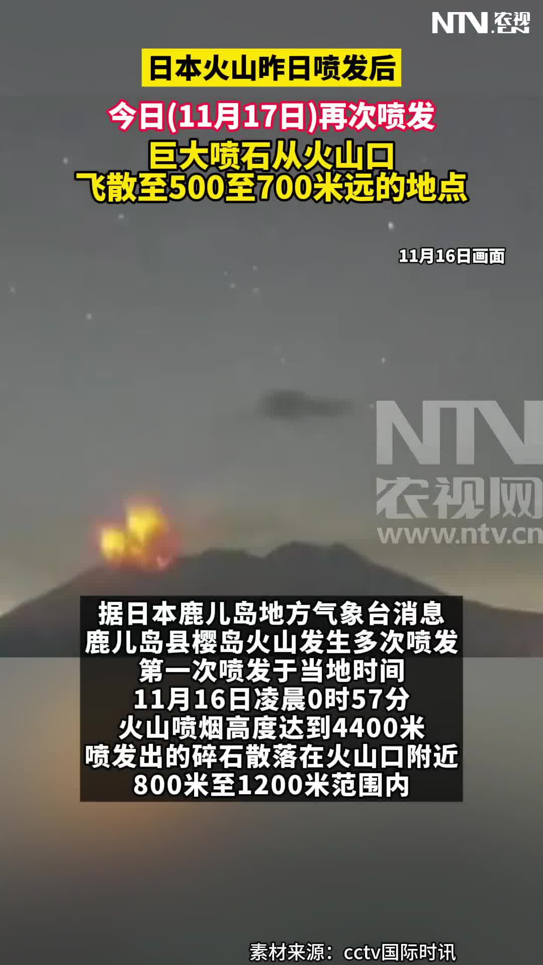 日本火山昨日喷发后,今日(11月17日)再次喷发