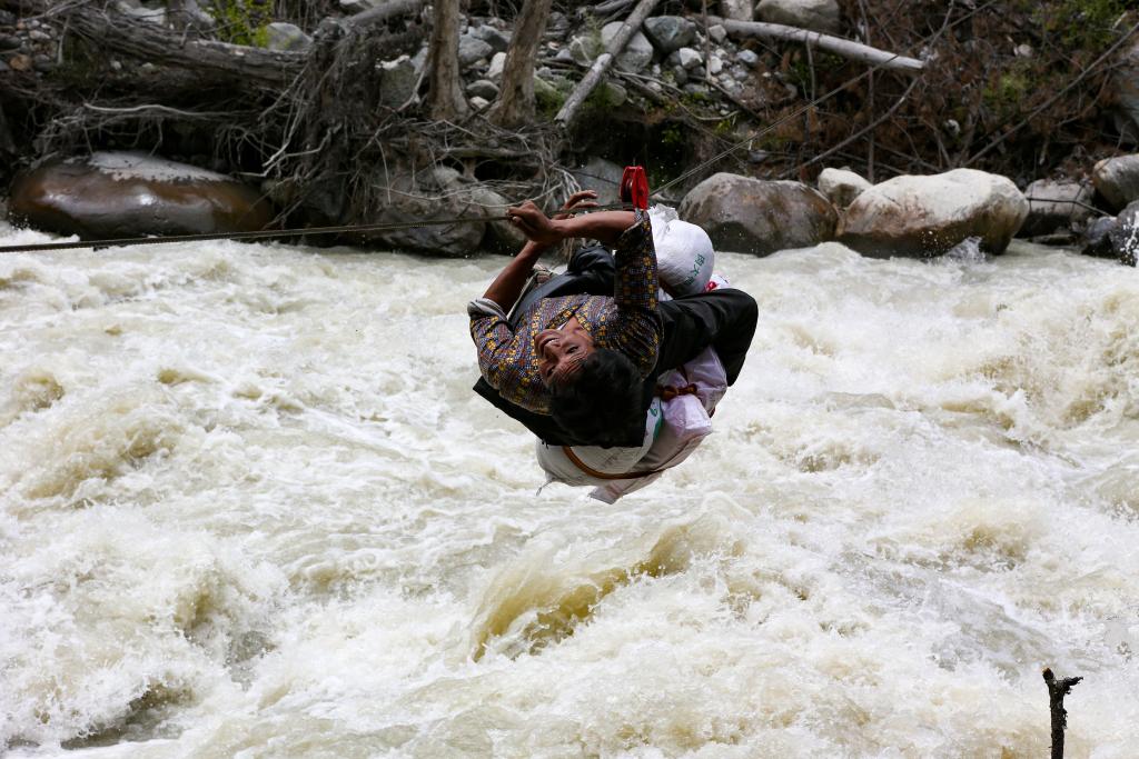 2015年7月31日,搜寻队在前往若果冰川的路上用滑索过河。
