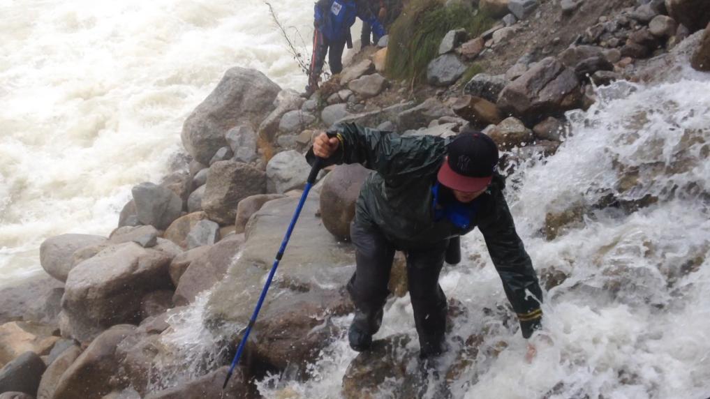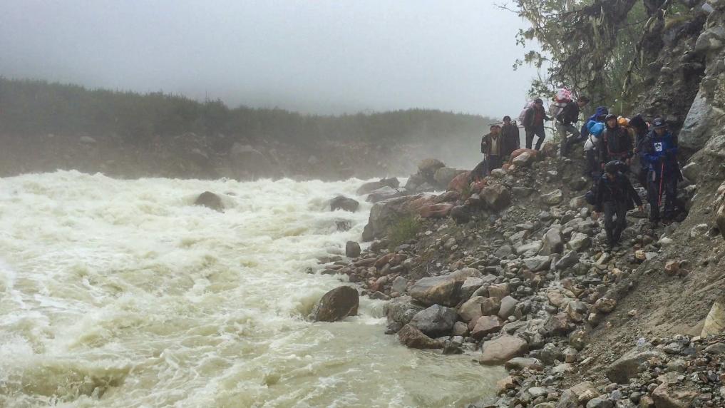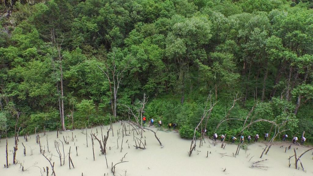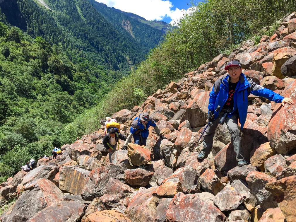 这是一条总长只有10公里,却漫长到令人绝望的路。湖边路完全在滑坡带上,上方是不稳定的碎石带,下方则是连绵不绝的大石堆,经过一天的奔波,体力已基本被耗尽我们就这样轮流背着体重80多公斤的同伴在破碎地形上前行……
