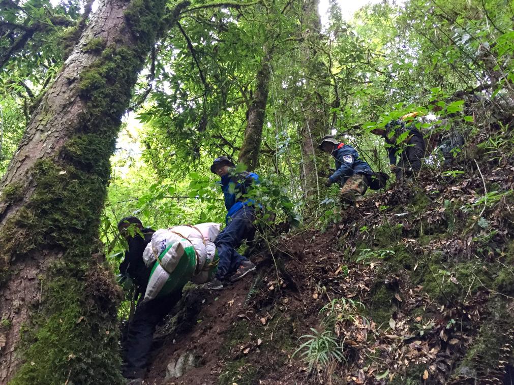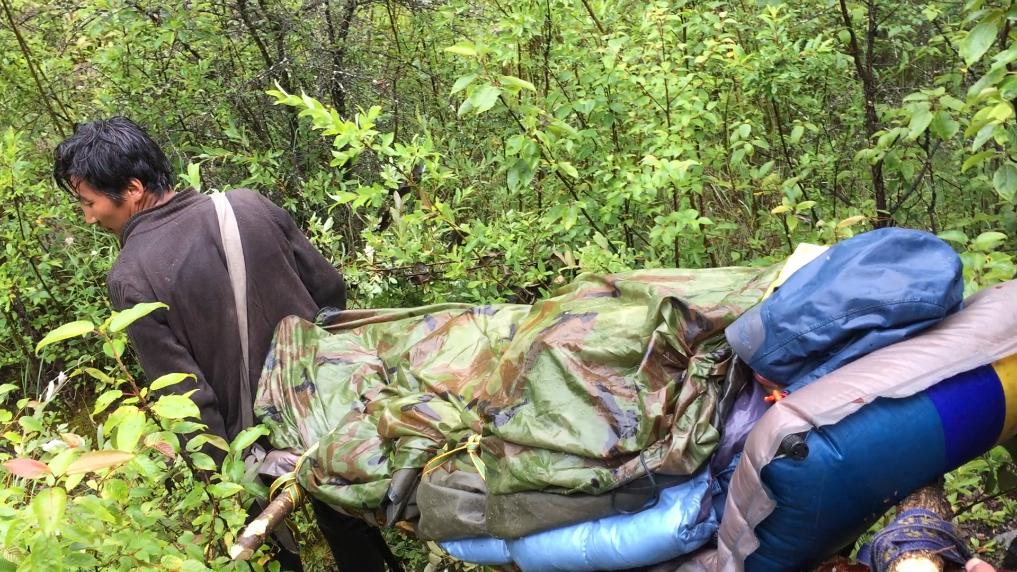 拔营下撤时,情况更坏了。雨下个不停,倪坚已经连说话都没有力气了,补给也已不多。此时距离走出大山还有50公里。路上我们得到山外同事的回复:山谷里全是乱流,直升飞机救援完全没有可能,但波密县人民医院的医生已在进山途中。据此我决定:我、童青松、罗松等13人组成救护团队,携带必备的辎重和所有的给养,采取一切可能的手段,押后护送倪坚出山;其他人携带文物,急行军到预设的补给点加拉巴冬河,尽速出山。