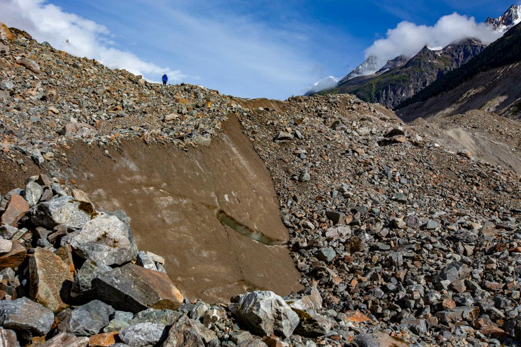8月5日,徒步进山的第6天,队伍从营地跋涉8公里后,于上午抵达若果冰川下缘冰碛,从这里再走约6公里的冰碛石头路就可以抵达坠机地点。但我们不是要翻越山丘,而是要走过亘古不化的冰川上覆盖着或厚或薄的碎石,每块石头都可能移动,比起小石块来说,看似稳固的大石块更可能是陷阱……石下是冰,冰下是冰川融水,我们仿佛走在一根巨大的正在融化的“巧克力雪糕”上,步步惊心。