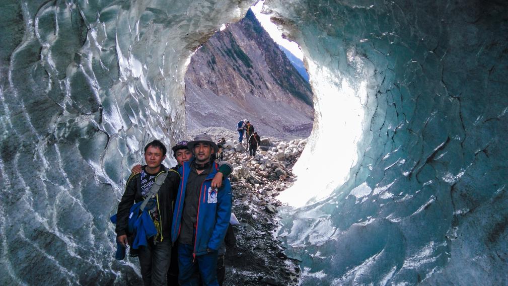 2015年8月5日,建川博物馆志愿者次仁(前右)与几位搜寻队成员在若果冰川一个融化的冰洞处合影。