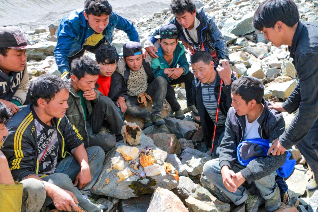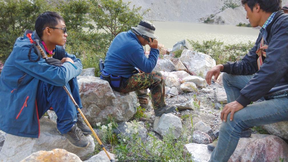 大概半个小时后,我找到了倪坚,发现他5个多小时才下撤不到2公里,躺在冰川下湖边滑坡带的一块石头上,胸闷,浑身无力,几乎无法动弹。我判断他可能罹患高原肺水肿,当即通过卫星电话与在山外负责指挥的同事取得联系,请他们马上联络救援力量。随后大家商定:当时在场队员分为两队,一队背负所有文物与辎重,先行赶往营地,再组织人力回援;另一队由我带领,在向导罗松的帮助下,指挥5位最强壮的当地志愿者轮流背负倪坚下撤。