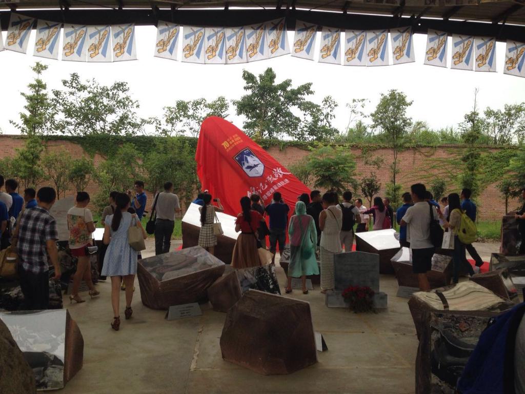 2015年8月16日,观众在四川建川博物馆观看《折翼——找寻C-87》大型图片装置展。 新华社发
