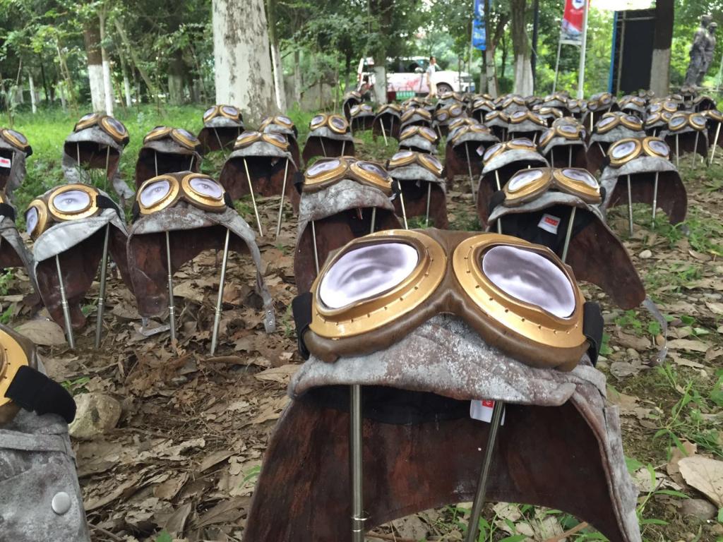 这是2015年8月16日拍摄的《折翼——找寻C-87》大型图片装置展中展出的100件飞行员头盔展品,寓意向“驼峰航线”飞行中牺牲的飞行员致敬。新华社发