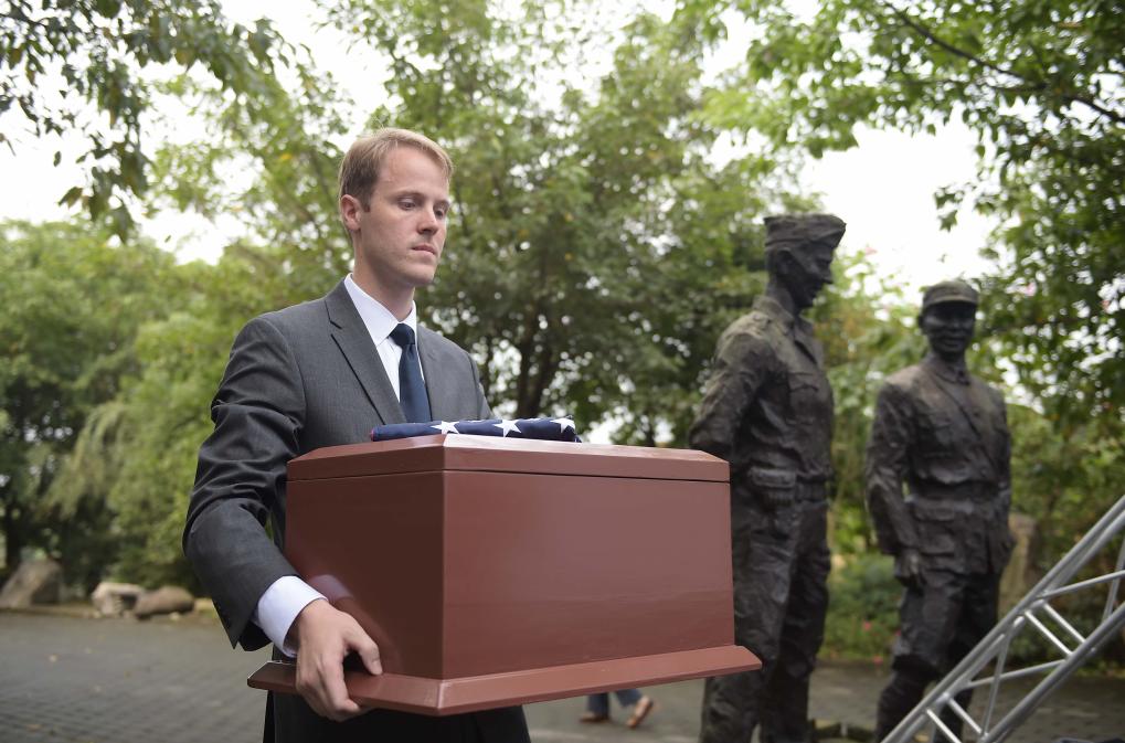 2015年10月22日,“二战援华美军骸骨移交仪式”在四川建川博物馆举行,来自美方的代表团把在西藏林芝波密县易贡乡若果冰川沉睡72年的“驼峰航线”美国飞行员遗骸接回家,图为美方工作人员怀抱“驼峰航线”美军骸骨盒。 新华社记者 薛玉斌 摄