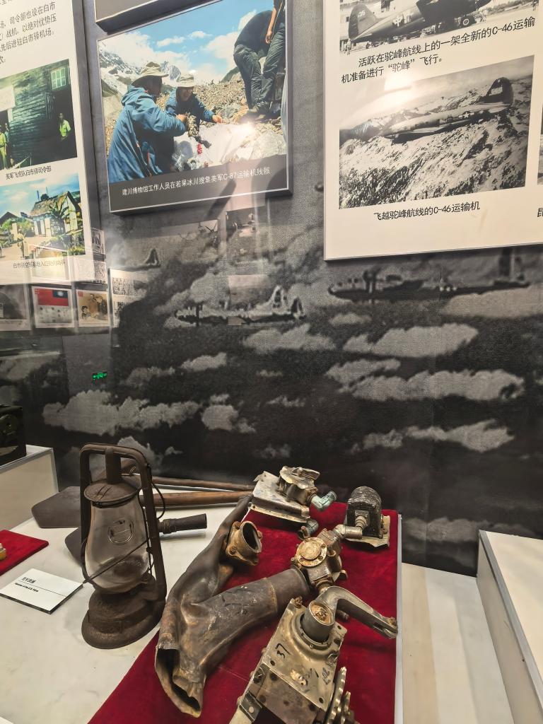 这是建川博物馆收藏展览的一件来自若果冰川的C-87坠机残骸,背景图片名为《飞越“驼峰航线”的中国士兵》(2025年11月6日摄)。 (建川博物馆供图)
