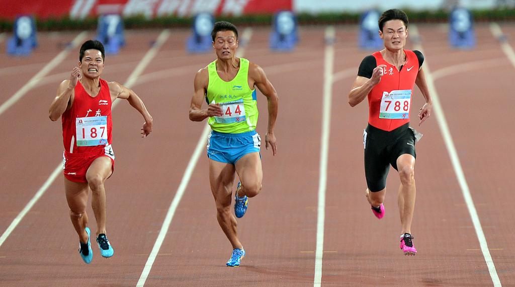 2013年9月8日,苏炳添(左)在第十二届全国运动会田径项目男子100米决赛中。最终,他获得亚军。新华社记者 杨宗友 摄