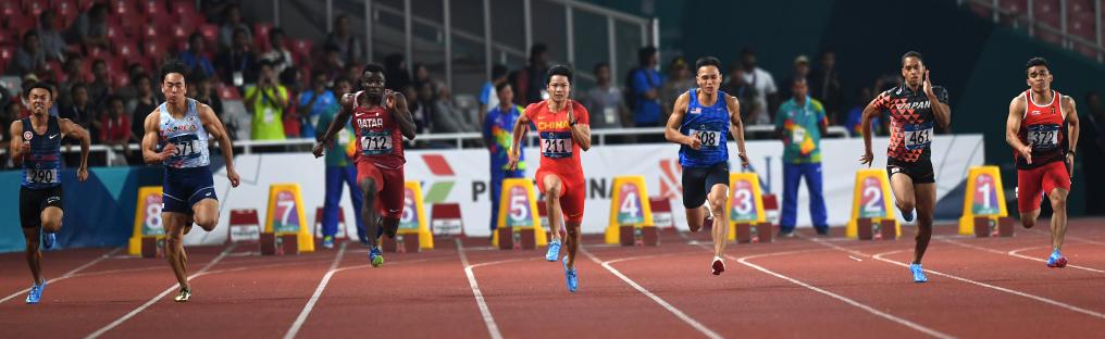 2018年8月26日,苏炳添(中)在第18届亚运会田径男子100米半决赛中。新华社记者 岳月伟 摄