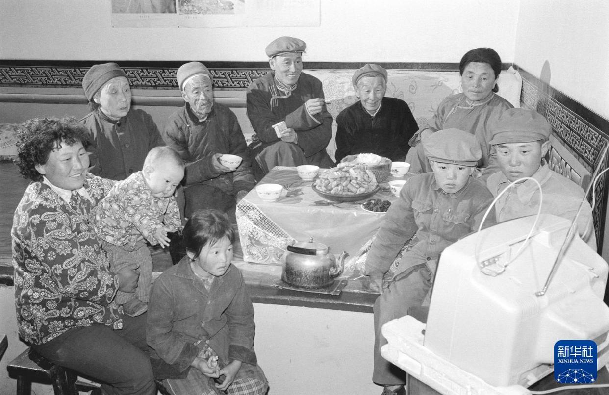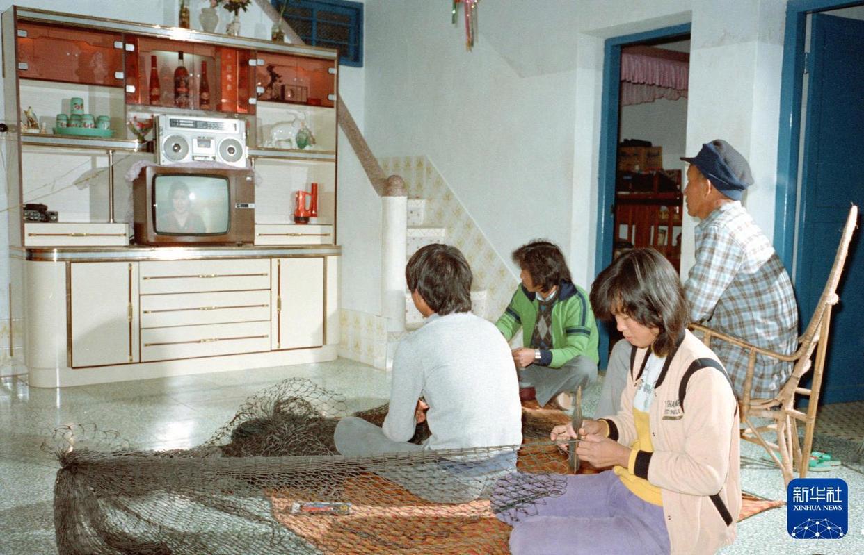 20世纪80年代,广东桂山岛渔民冼十五一家,晚饭后在客厅里看电视节目。新华社记者 池兴旭 摄