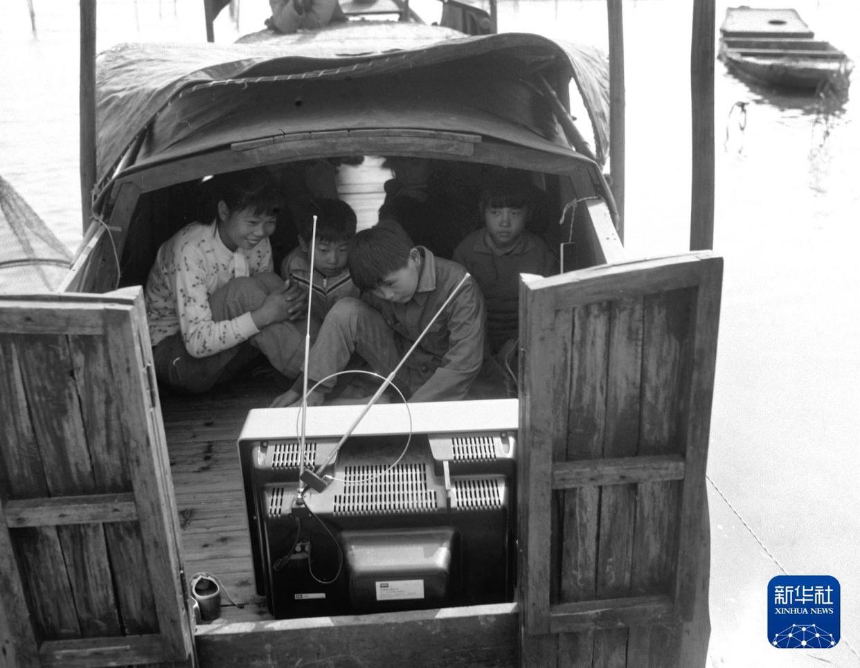 1987年,浙江湖州的小朋友们在船上看电视节目。新华社记者 徐邦 摄