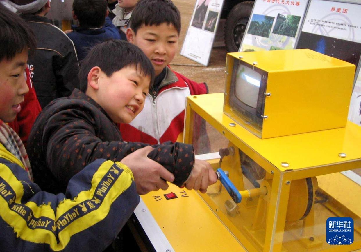 2004年1月10日,几名小朋友用摇把转动手摇电机发电,观看电视。新华社记者 王颂 摄