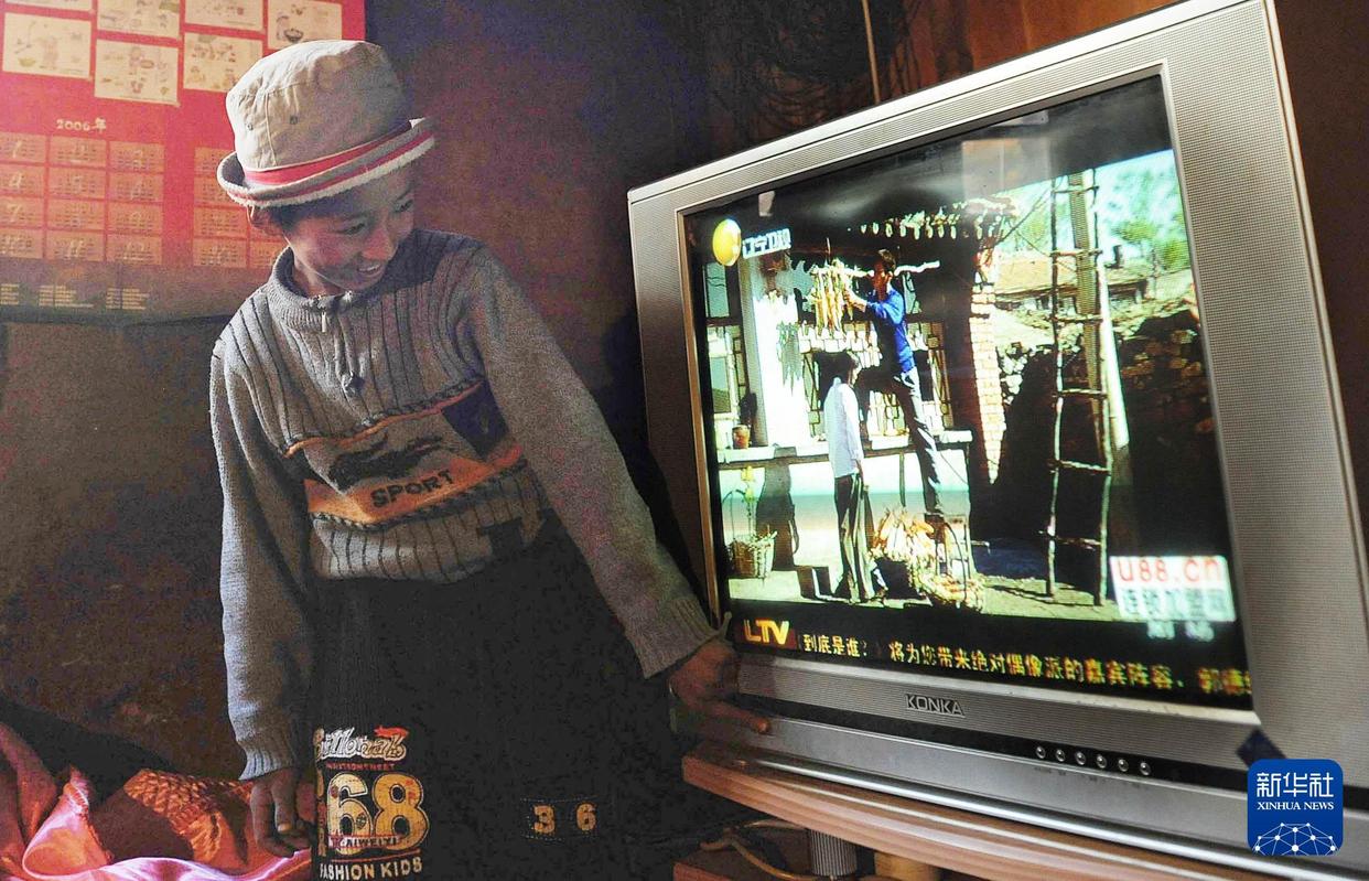 2009年2月15日,云南省迪庆藏族自治州德钦县云岭乡红坡村一名藏族男孩在家里看电视。新华社记者 蔺以光 摄