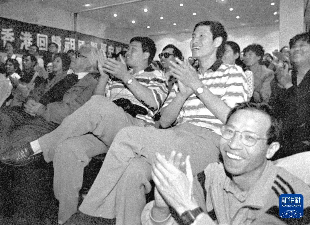 1997年,中国旅法留学生在巴黎收看电视现场直播看到五星红旗和香港区旗在香港政权交接仪式上冉冉升起,热烈鼓掌。 新华社记者 郑宣 摄
