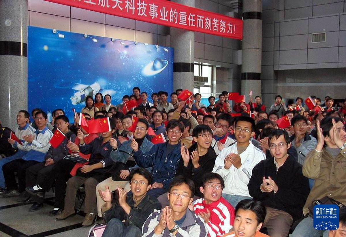 2003年10月15日,北京航空航天大学各院系100多名研究生在电视大屏幕前观看神舟五号发射的新闻。新华社发(国欣 摄)