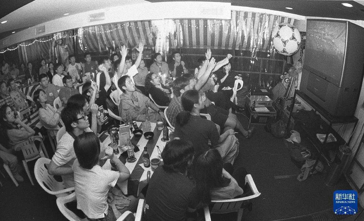世界杯足球赛在法国拉开帷幕,引起香港球迷的极大关注。1998年6月10日夜,球迷们聚集在酒吧观看电视直播开幕式及首场比赛。新华社记者 卢炳辉 摄