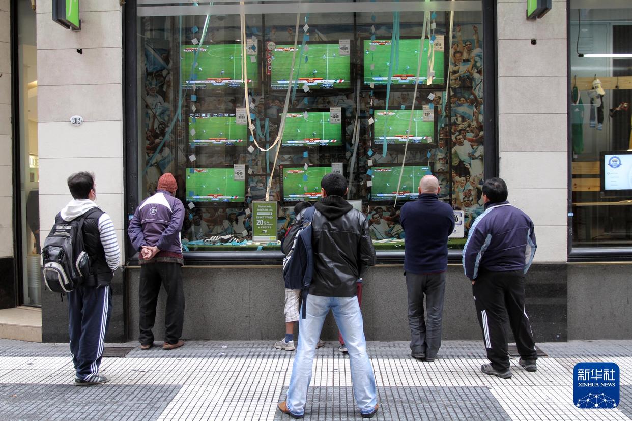 2010年6月27日,在布宜诺斯艾利斯街头,几名行人透过橱窗观看电视直播。当日,在约翰内斯堡足球城球场进行的南非世界杯八分之一决赛中,阿根廷队与墨西哥队角逐激烈,阿根廷首都布宜诺斯艾利斯万人空巷,各行各业的人都暂停手中的工作,观看比赛。新华社发(马丁·萨巴拉摄)