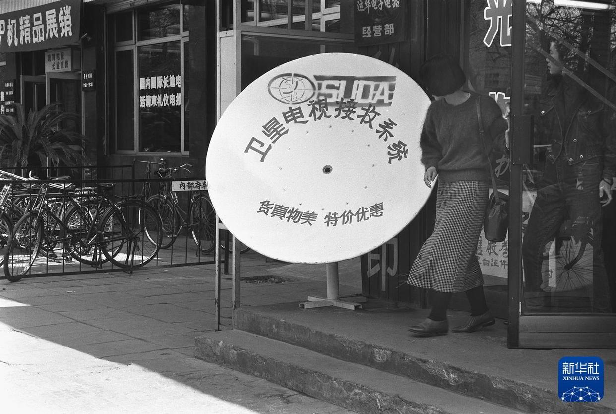 1993年,北京街头出售家庭用卫星电视接收系统的电器商店日渐增多。用户使用这种系统可以接收亚洲一号卫星发射的电视信号,从而增加收看电视节目。新华社记者 黄文 摄