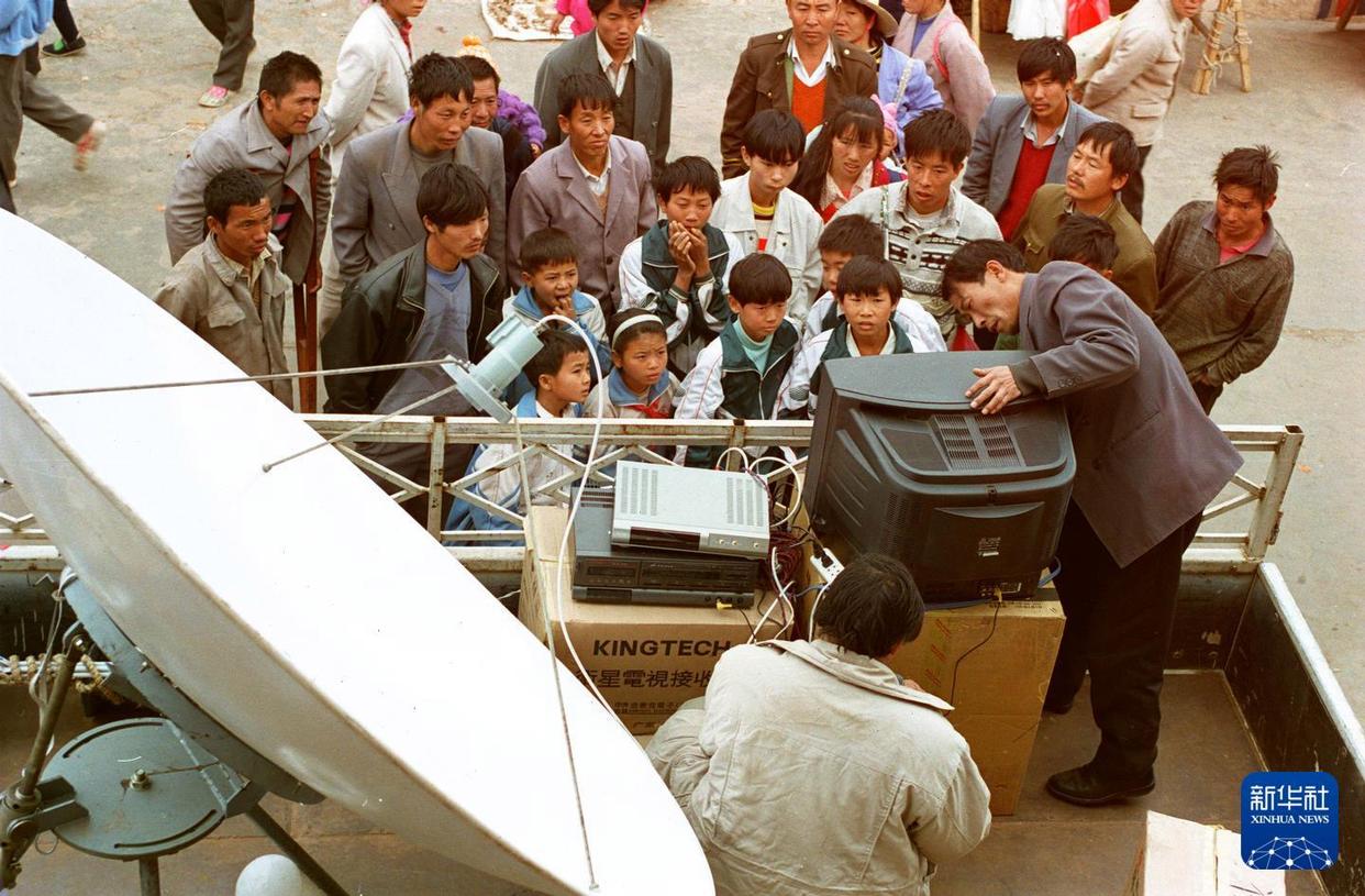 1998年,云南楚雄彝族自治州广播电视局的技术人员为群众调试电视。新华社记者 王长山 摄