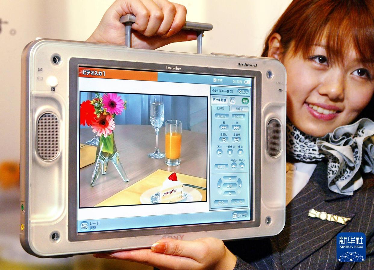 2004年1月19日,日本索尼公司员工在东京展示该公司的新产品——便携式无线电视机。新华社发