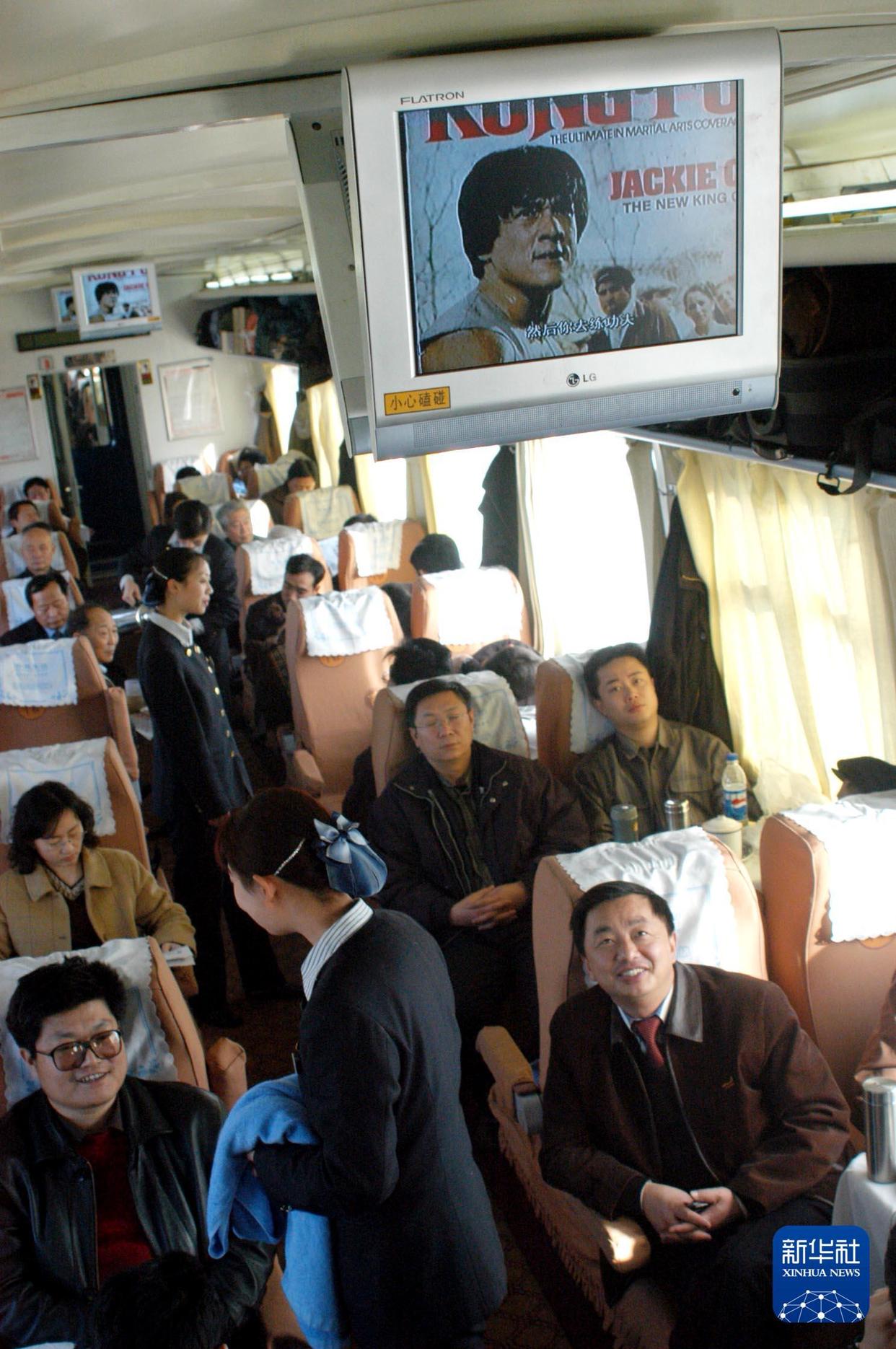 2003年12月26日,乘坐济南至北京T35/6次列车的旅客在看电视。新华社发(江浩 摄)