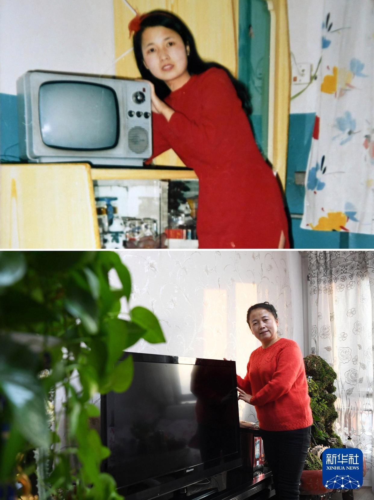 上图:1990年9月20日,在甘肃省兰州市西固区,26岁的陈玉芳在家里的电视机前。当时,陈玉芳一家三口住在30平方米的一室一厅里,家里仅有一台9英寸的黑白电视机。下图:2018年11月13日,在甘肃省兰州市西固区,54岁的陈玉芳在家里的电视机前拍照(新华社记者 陈斌 摄)。陈玉芳是绒线厂退休职工,她已搬进了80平方米的新房,电视机换成了42英寸的液晶智能电视。而未来