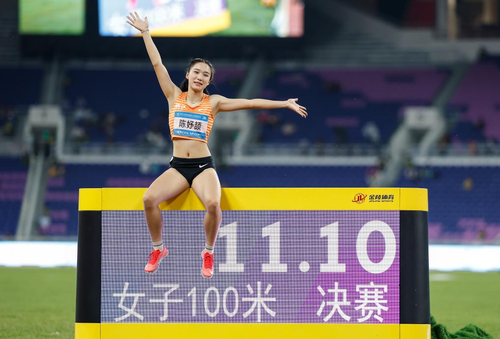 11月17日,浙江队选手陈妤颉在女子100米比赛后与成绩显示屏合影。她夺得冠军。新华社记者黄伟摄