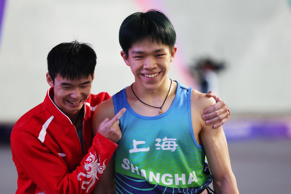 11月14日,上海队选手赵一程(右)在男子速度攀岩比赛后。新华社记者杨世尧摄