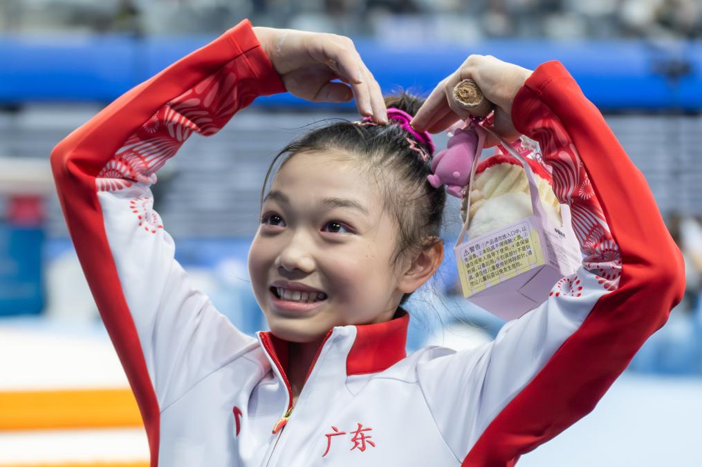 11月15日,广东队选手柯沁沁体操项目女子个人全能夺冠后向观众致意。新华社记者杜子璇摄