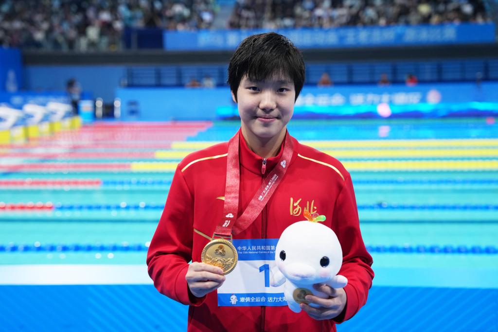 11月17日,女子400米个人混合泳冠军河北队选手于子迪在颁奖仪式后。新华社记者杜宇摄