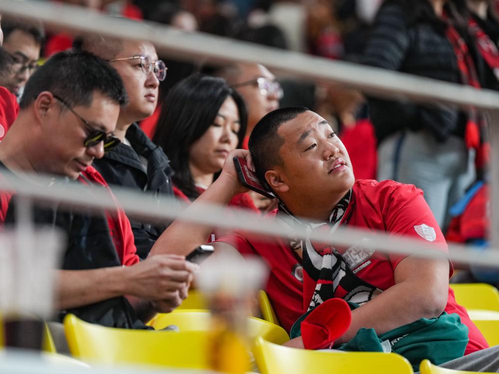 10月31日,成都蓉城队球迷在主队不敌河南俱乐部酒祖杜康队后表情失落。新华社记者 王曦 摄