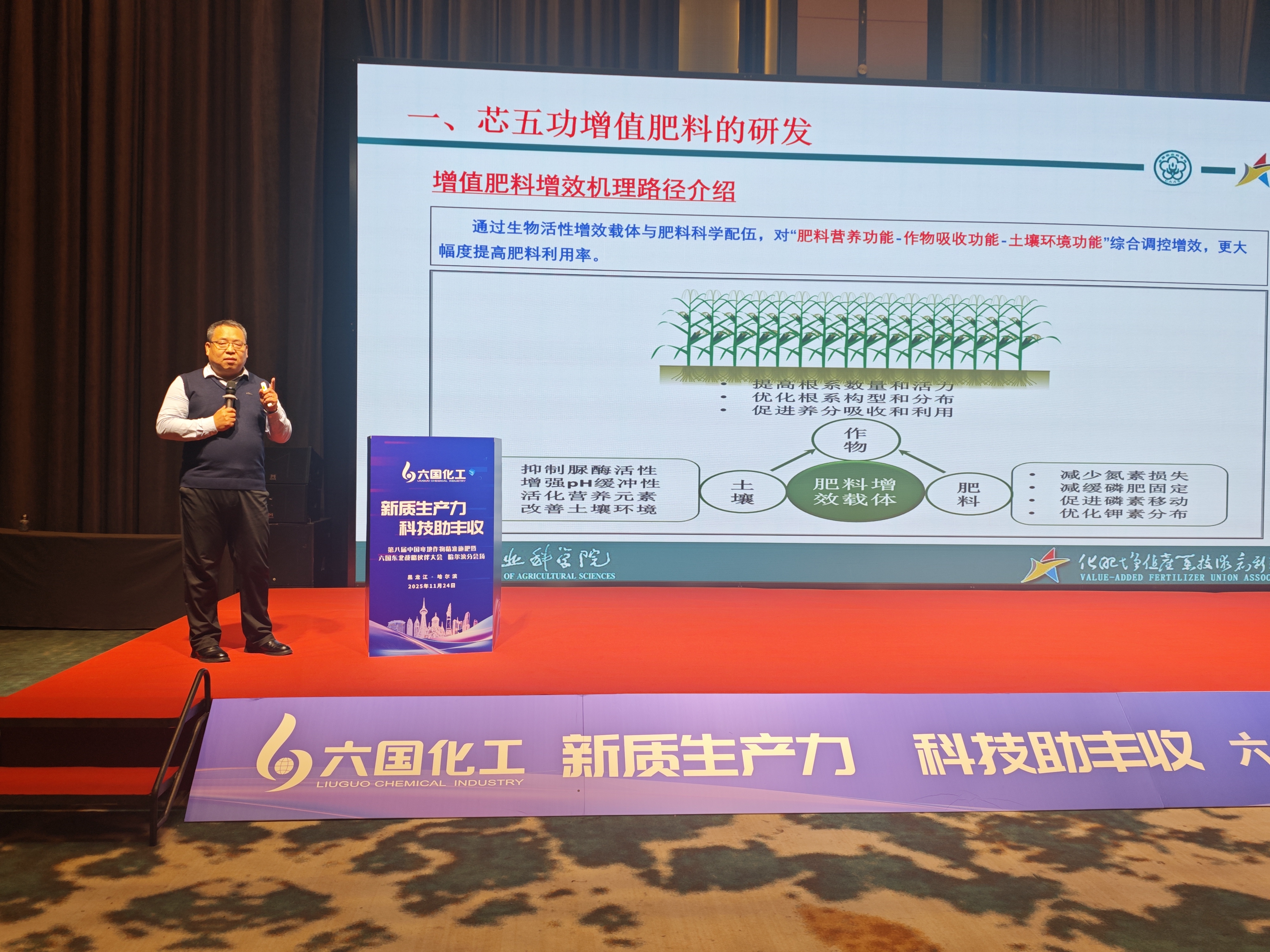 中国农业科学院肥料增值技术推广专家赵立虎在专题报告中指出,六国化工以“减肥增效”为目标,联合中国农科院资划所共同研发的新一代绿色增值肥料“芯五功”,通过综合调控“肥料-作物-土壤”系统,实现肥效的系统性优化。经市场验证,该产品在抗逆稳产、肥料增效与地力提升方面表现卓越。