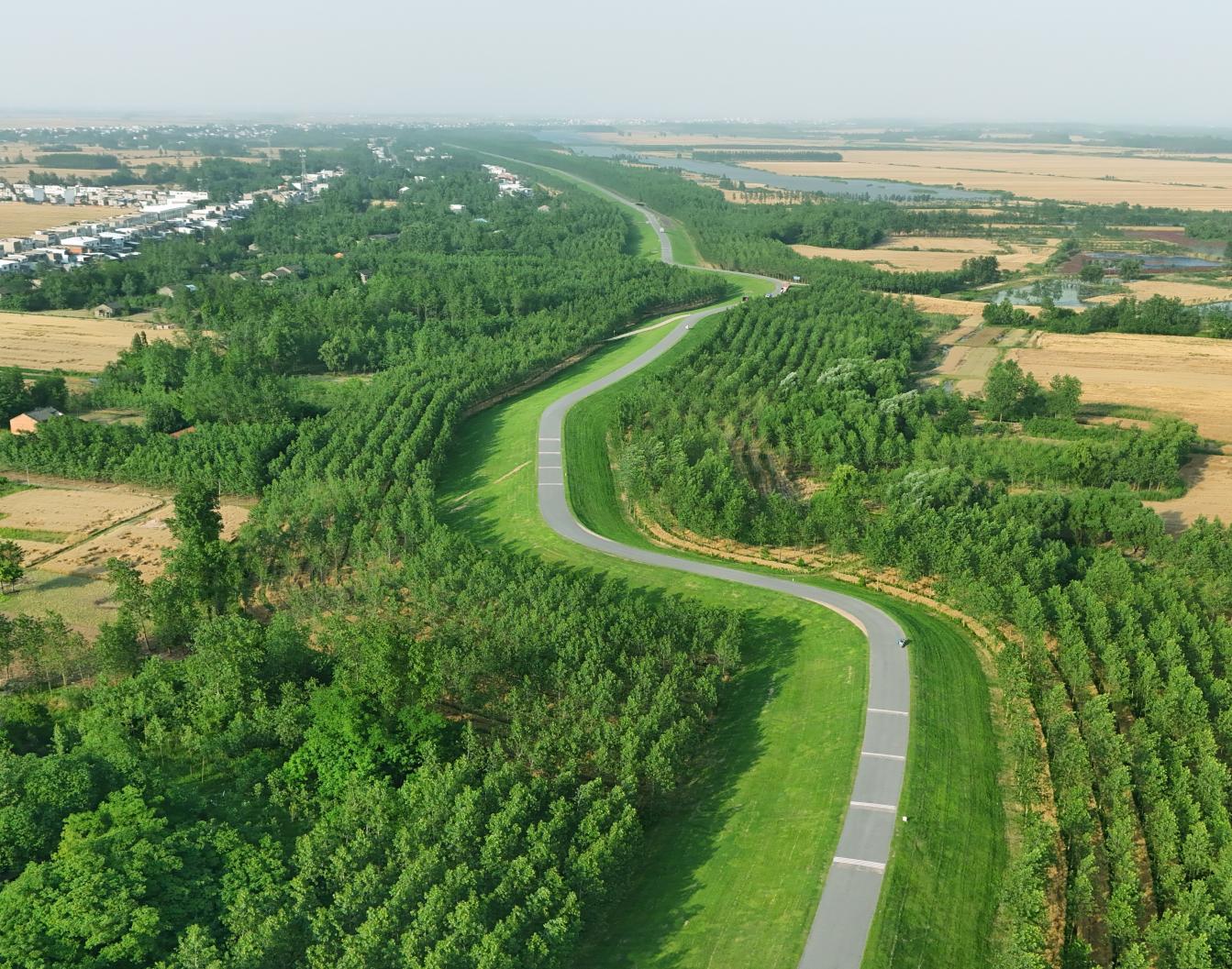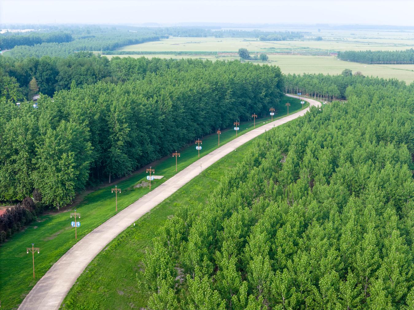 如今再登堤,景象已换。曾经的黄土坡被整齐的水泥护坡取代,泛着青白的光,这也让大堤成为坚不可摧的二级堤防,1998年洪水肆虐的记忆彻底成为历史。堤顶公路平坦如砥,太阳能路灯串成珠链,蜿蜒向远方,取代了昔日坑洼的土路与昏暗的油灯。最动人的是两岸的绿意——万余亩的绿化造林让“两林夹一堤”的景观亭亭成型,垂柳依依拂水,杨树挺立如卫士,与人工加固的堤身相得益彰。曾经侵占护堤地的砂场、违建被悉数拆除,复绿区域芦苇摇曳、菖蒲丛生,成了白鹭、水鸟的乐园,清晨总能看见它们贴着水面低飞,划出灵动的弧线。