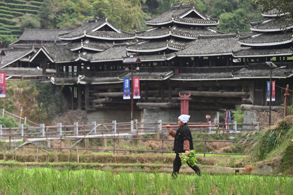 在三江侗族自治县独峒镇岜团村,村民在风雨桥附近经过(2025年11月5日摄)。