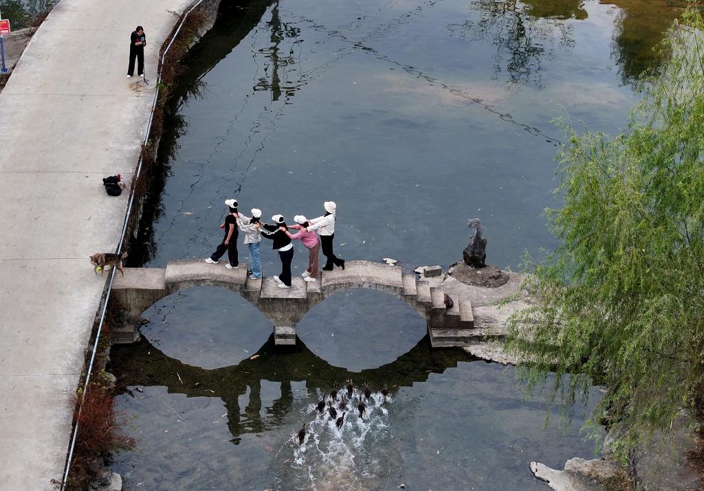 在柳州市柳江区进德镇乐山村,游客在小桥上拍照(2025年11月1日摄)。