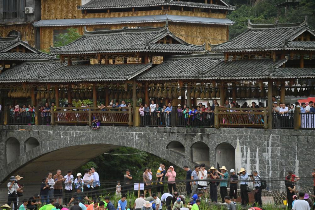 在广西融水苗族自治县安太乡培秀村,村民和游客在风雨桥上观看抓鱼比赛(2025年10月18日摄)。