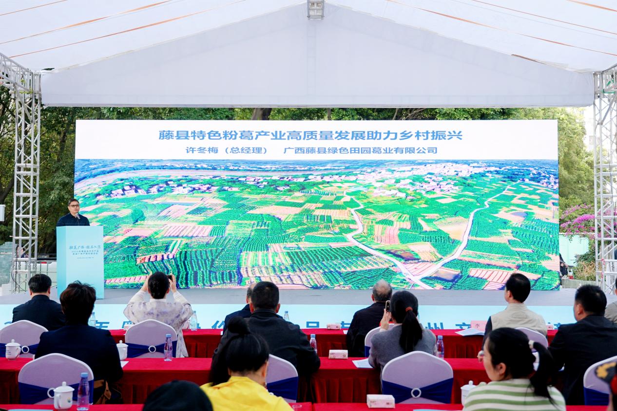 随后,来自梧州、北海、钦州、防城港、玉林五市的代表企业分别登台进行推介——梧州市企业聚焦优质葛制品,突出生态种植与精深加工优势;北海市企业依托海洋资源禀赋,重点推介标准化生产的海产加工品;钦州市企业以特色荔枝为核心,讲解传统水果与现代技术结合的生产模式;防城港市企业围绕珍稀金花茶产业,介绍产品研发与健康价值;玉林市企业则以本土优质茶叶为重点,呈现茶叶种植、加工全链条标准化体系。