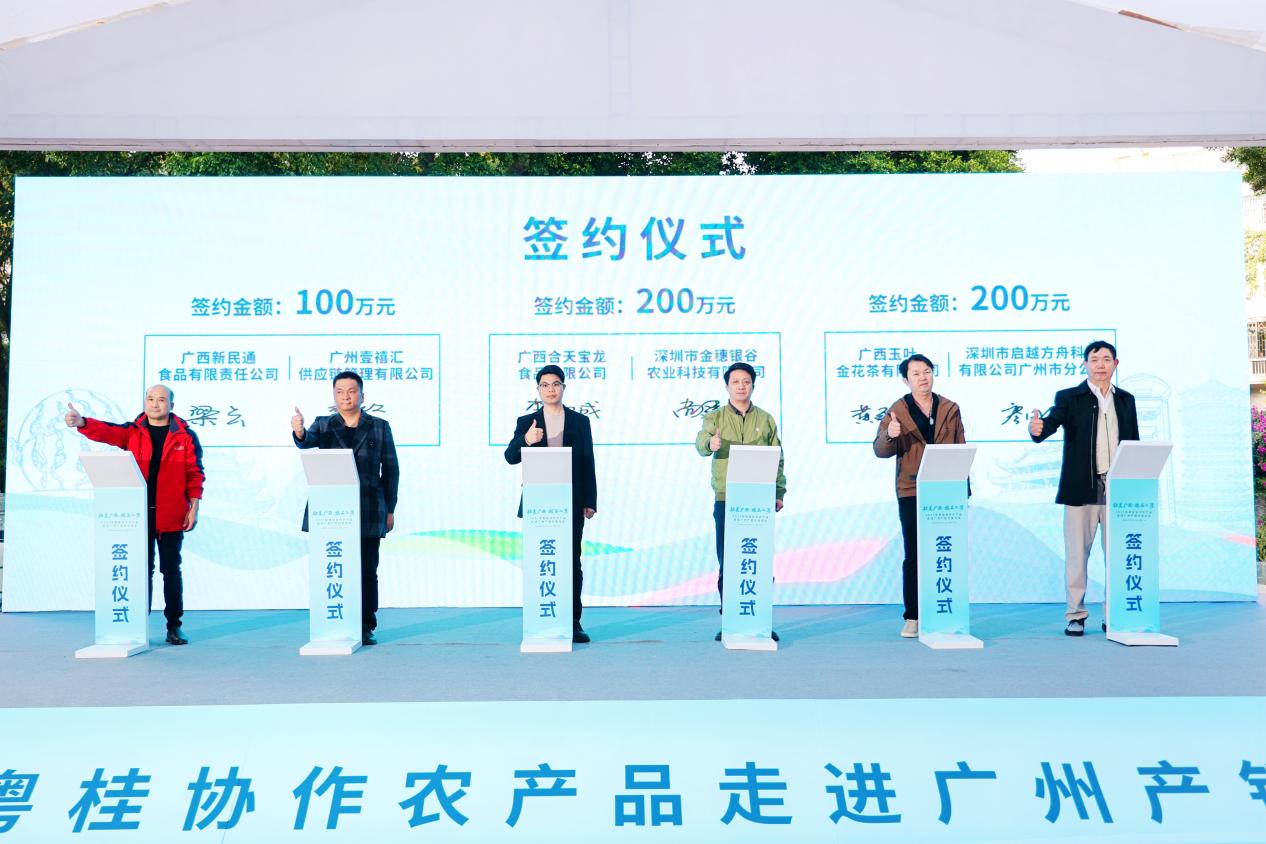 在现场嘉宾的共同见证下,广西参展企业与大湾区采购商代表正式签约,涵盖葛制品、海产加工品、特色干货、金花茶系列、茶叶等多个品类,签约金额再创新高,为广西特色农产品稳定进入大湾区市场搭建了长效通道。
