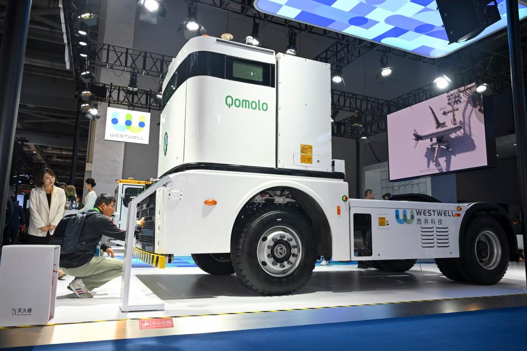 2025年11月6日,观众在第八届进博会汽车及智慧出行展区西井科技展台拍摄展品Q-Truck全时无人驾驶集卡。新华社记者 陈浩明 摄