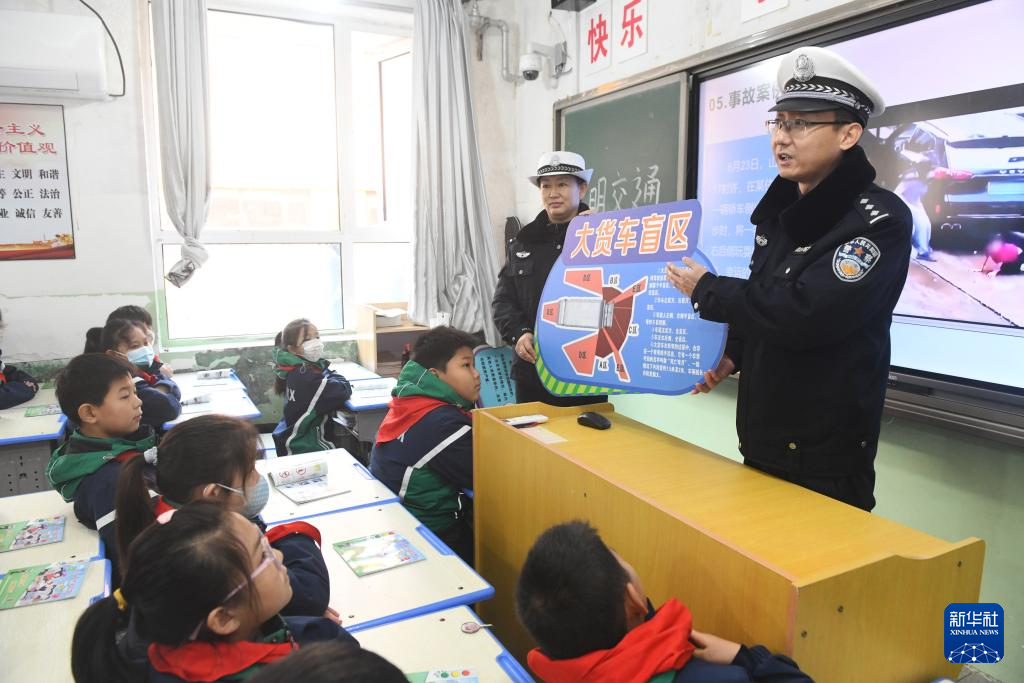 12月2日,在河北省石家庄市栾城区第五中学,石家庄市公安局栾城分局交通管理大队民警为学生们讲解如何避开汽车盲区,远离危险 (无人机照片)。