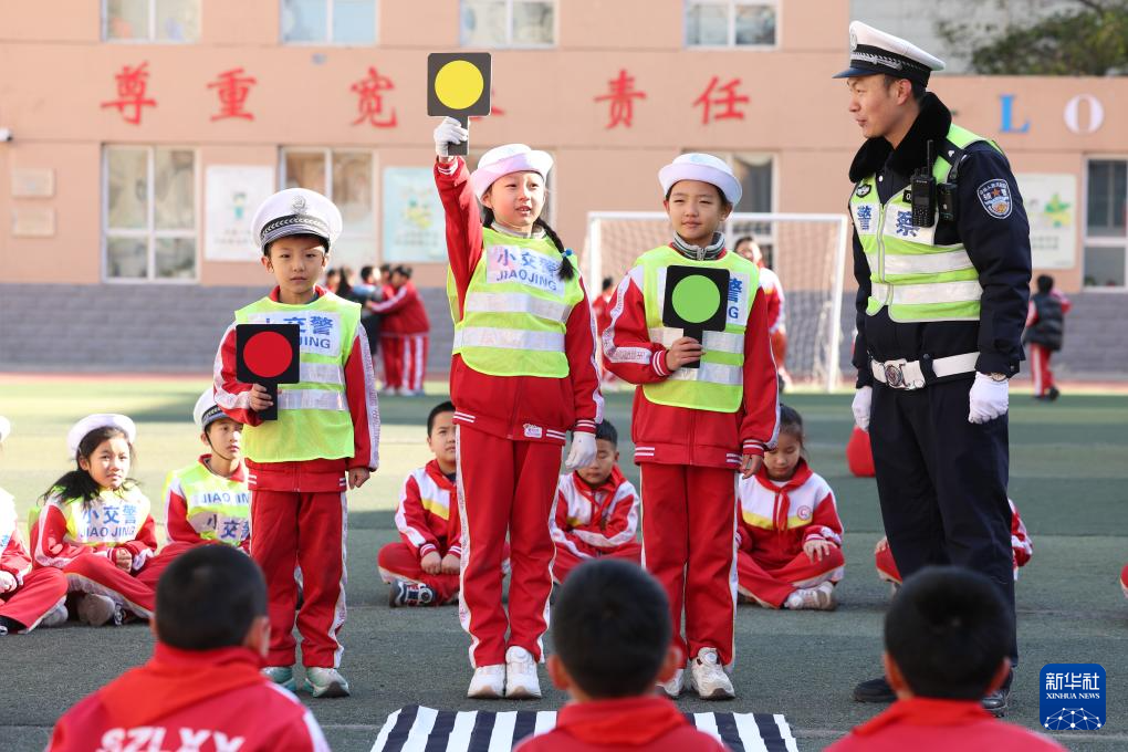 12月2日,在河北省石家庄市四中路小学,一名辅警和小学生们进行信号灯互动游戏。