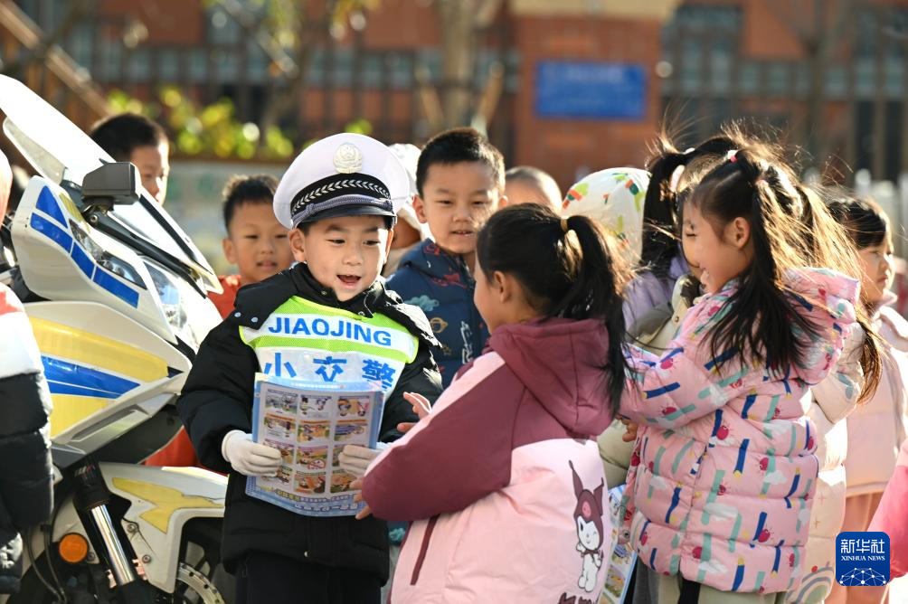 12月2日,在河北省石家庄市新华区柏林幼儿园,一名“小交警”给小朋友发放交通安全宣传页。
