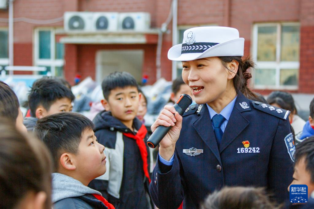 12月2日,在河南省商丘市睢县古襄路小学,睢县公安交通警察大队民警通过问答的方式给学生们宣传交通安全知识。