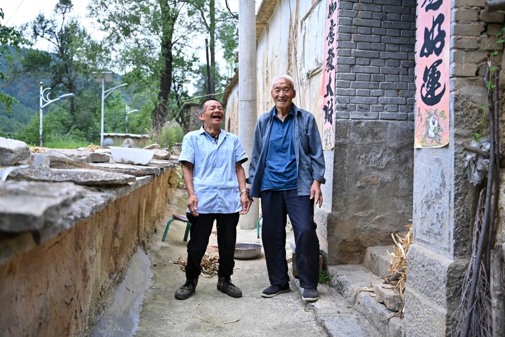 ↑村民元有才(右)为秦海松准备好午餐后,两人开心交流(2025年8月6日摄)。